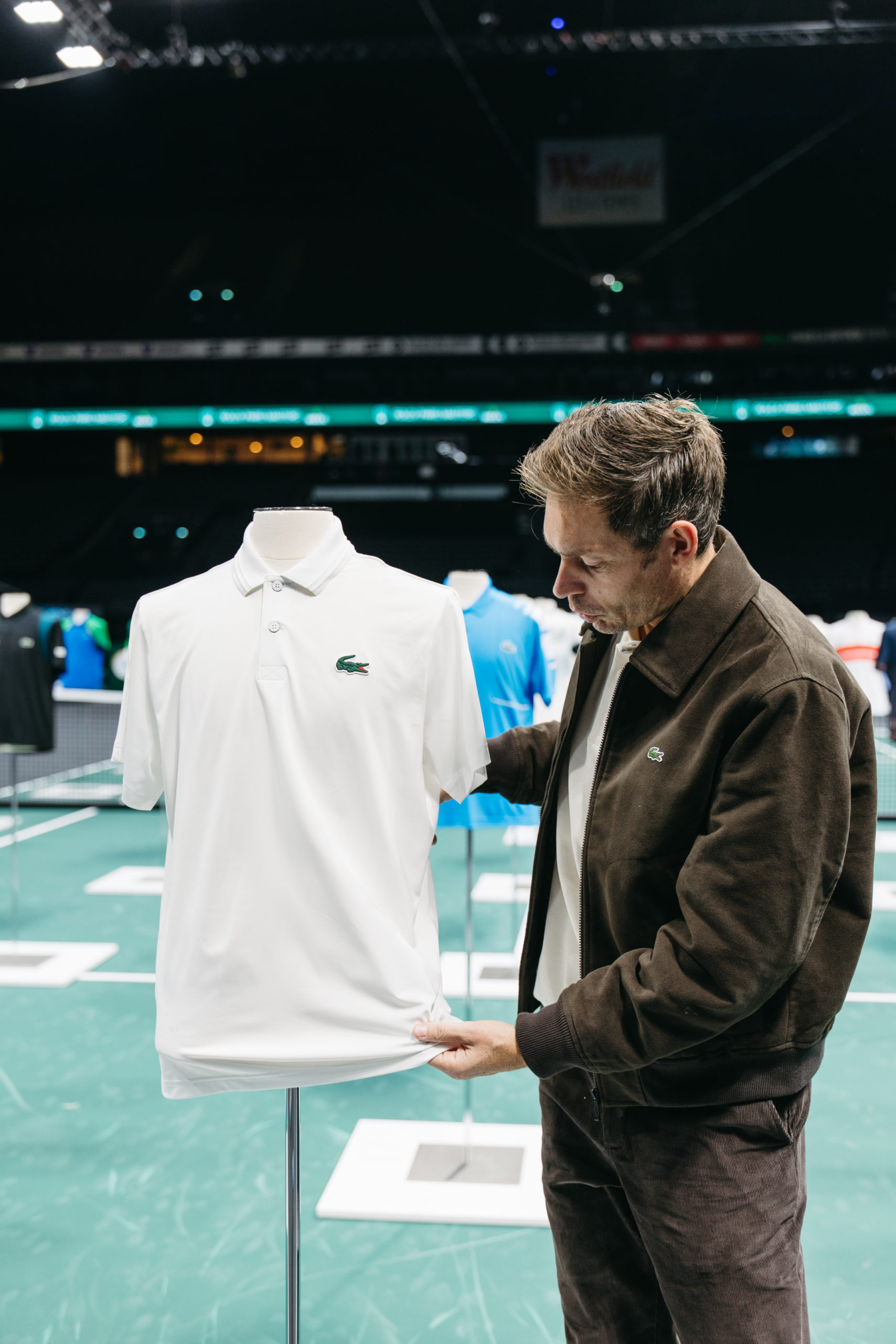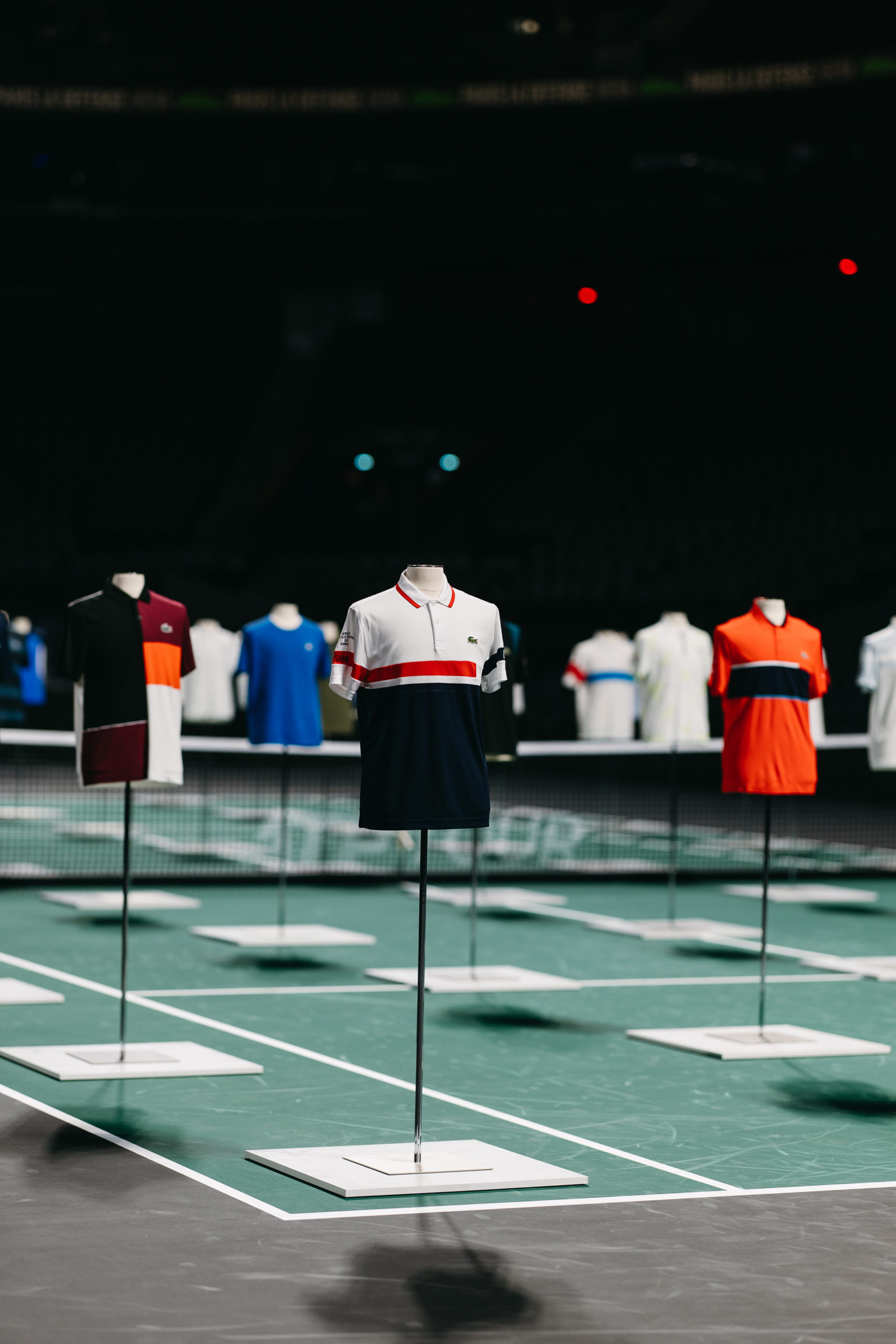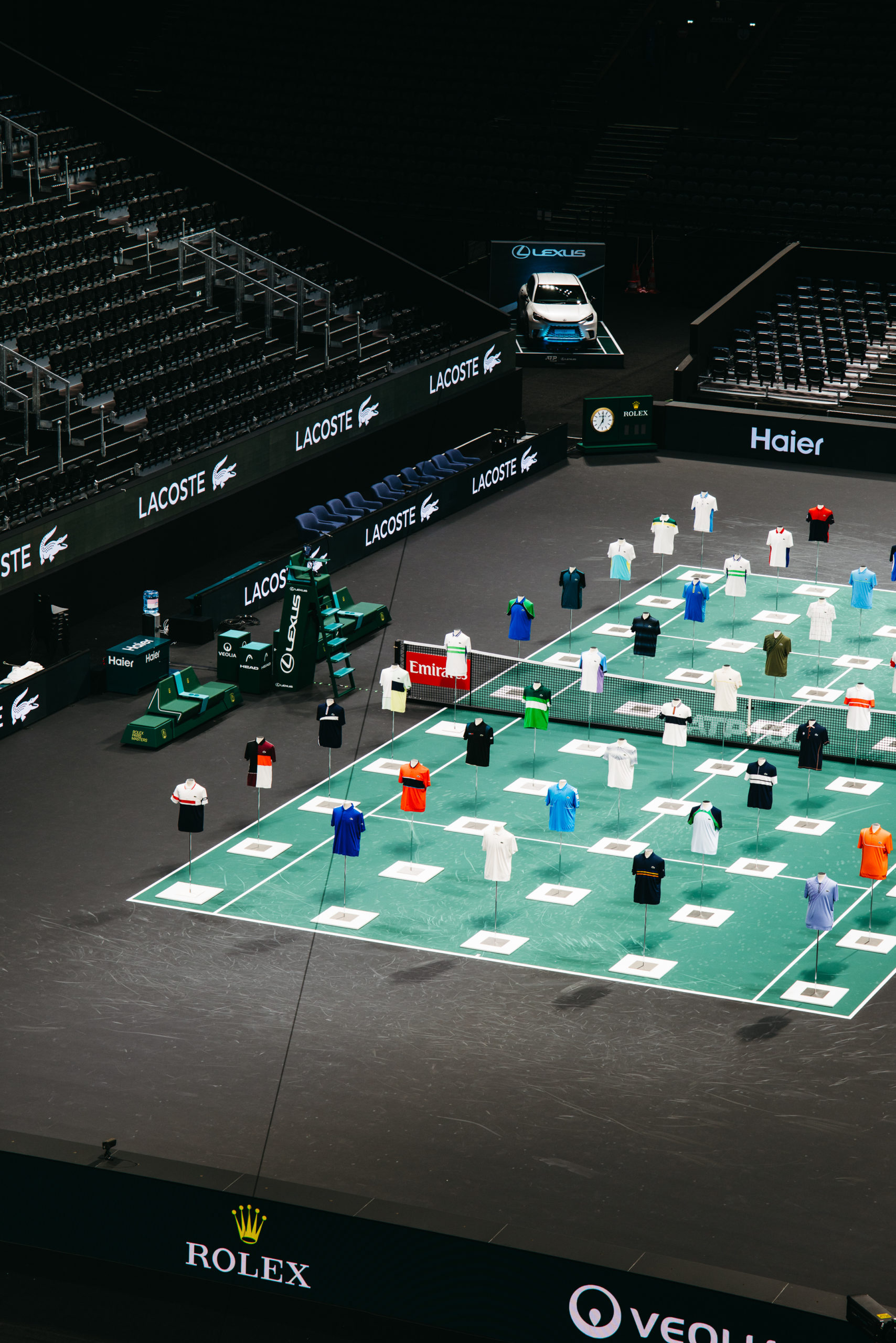 Pour marquer son dernier match, la marque au crocodile a imaginé une installation symbolique : 50 polos portés par le joueur tout au long de sa carrière, réunis pour raconter son histoire.